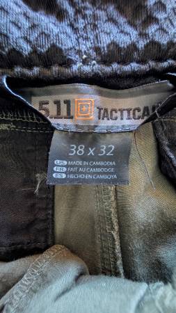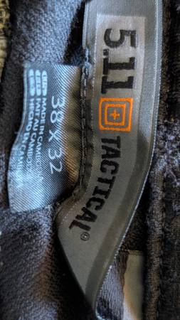5.11 Tactical Pants, one is multi cam and other is ranger green. Size is 38 x 32. These are heavy duty pants, both have built in knee pads.