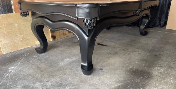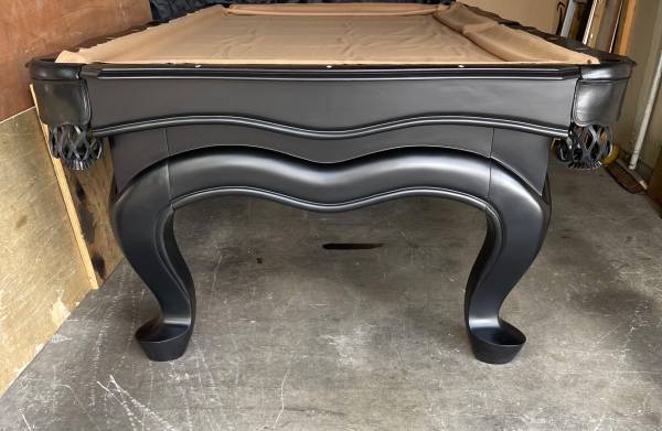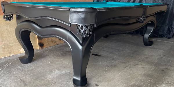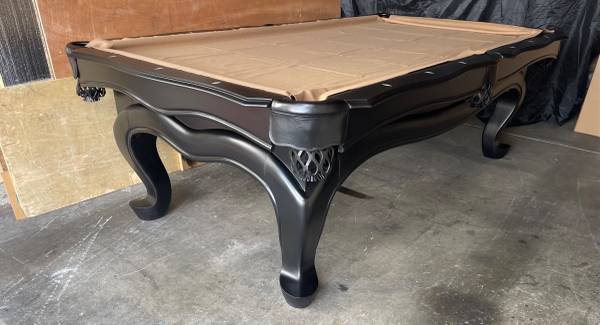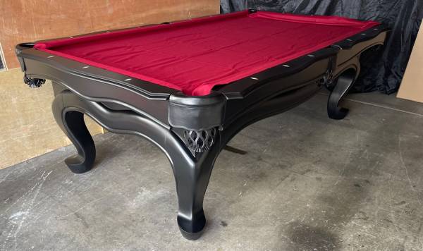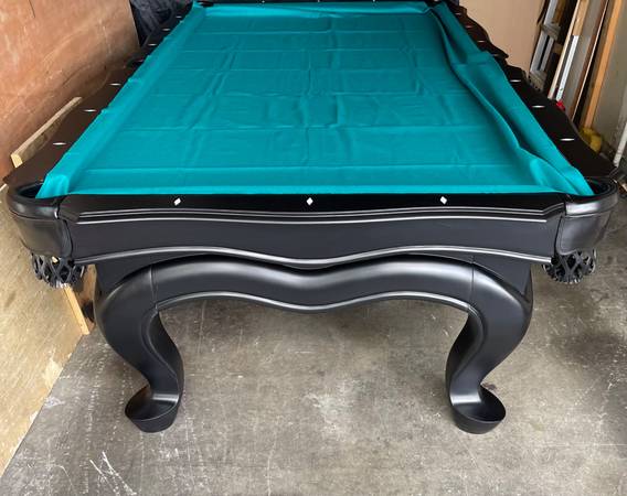 Stunning Black finish solid wood 3pc 1” slate billiards pool table with new felt in choice of color, 4 cue sticks, set of balls, wall rack, triangle, chalk and brush.
