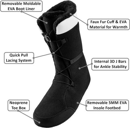 INTERIOR LINER – The inner moldable boot liner is removable and uses body heat to achieve a custom fit that is molded to your foot shape. The EVA foam liners also feature internal 3D J-bars around the ankle for a secure and comfortable fit. The removable 5mm EVA insole footbed to provides cushioning and stability. The boot liner also has a quick pull lacing system that you can easily adjust while wearing gloves. EVA material and faux fur collar of the liner provide insulation.