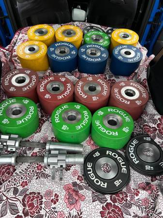 Ethos Bumper weight Plates, 6x 45 lb, 2x 25b, $1.5/lb. Can sell them separately in pairs