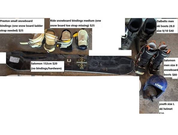 Salomon snowboard 60" or 152cm. Some nicks and top surface gauging. No bindings or hardware. (hardware can be usually found free at sporting goods stores in the parts bins). $20