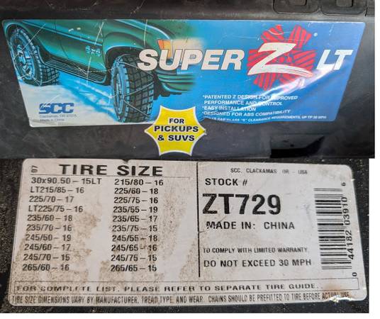 $40. Super Z SCC ZT729 tire traction snow chains cables for pickup, SUV, light truck. Includes tighteners. A bit of rust as is usual with used chains, but overall decent shape. Fits the following tire sizes: