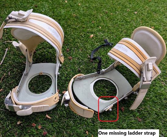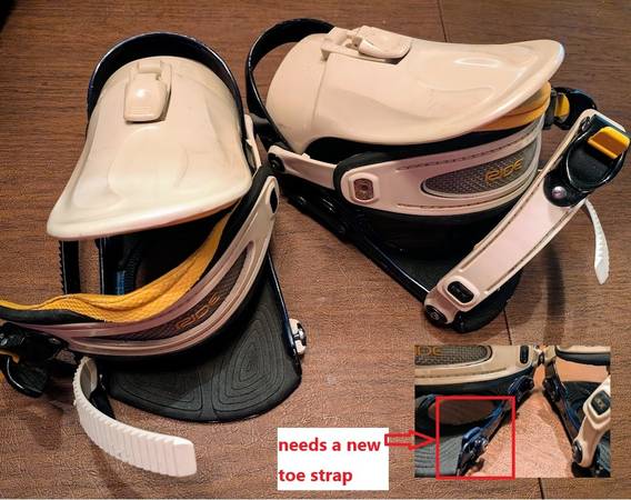 Ride snowboard bindings medium. The toe strap on one binding got damaged, so needs to be replaced. Otherwise these are in usable condition. I believe these are a size Medium based on the boot we used with them, but I don't see the size marking so cannot be 100% sure. $25