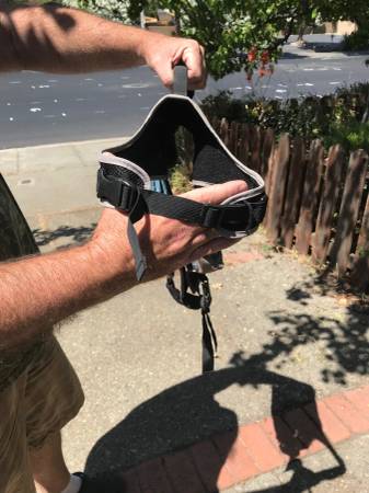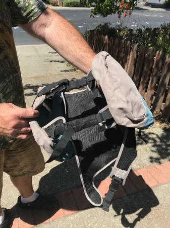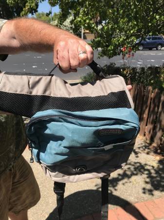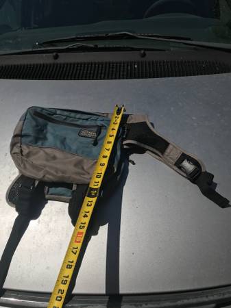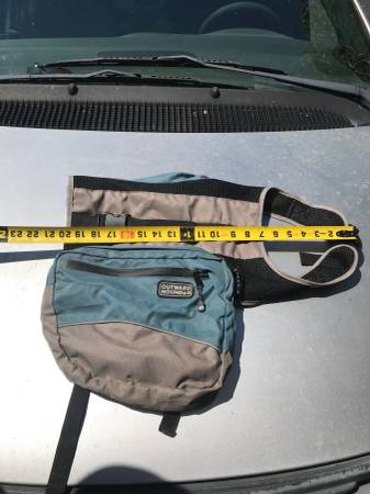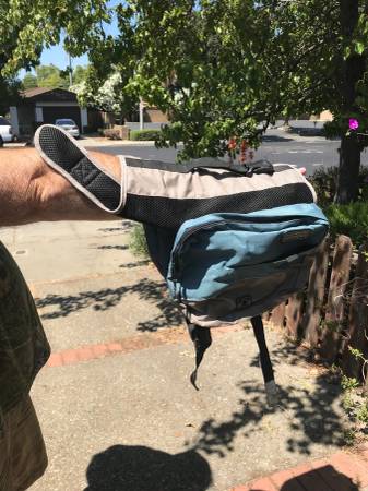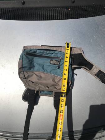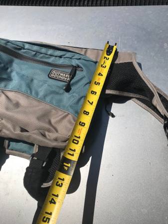 Not marked as to size, but lots of pics showing the measurements, all works fine...$25 trail trip car vacation back pack backpacking wear cloth cloths clothing p0p tote dog pet dogs coat jacket