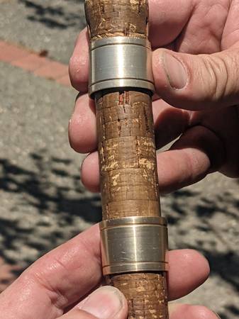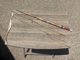 This is a great example of a rod that is of California vintage...made in 4 small sections so you can easily transport in into a backpack, and is for the sierras mts , in particular...light wt rod, made so you can attach a fly reel at the bottom handle...or put a spinning reel on it and the reel is mounted higher up...with the 2 sliding metal bands. just under 8 foot in length...They work fantastic, and r getting harder to find anymore.
