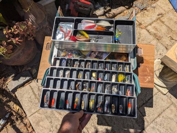 p45kk1.5 fish fishing gear vnt vintage antique gift fathers day mancave 1000 a us cabin retro tool chest box carry accordion tote part parts lure lures tackle pole poles reel reels storage garage bead beads blue green silver sewing not Plano penn rebel large aluminium utility 7 tray 3 tier vnt antique