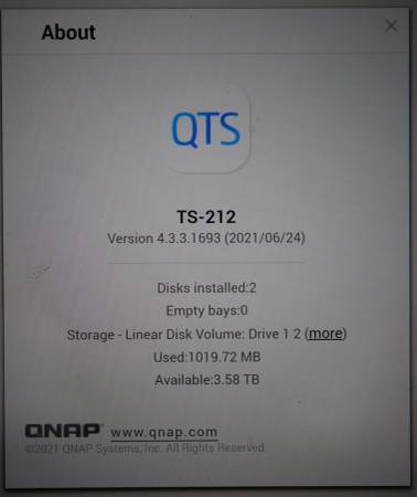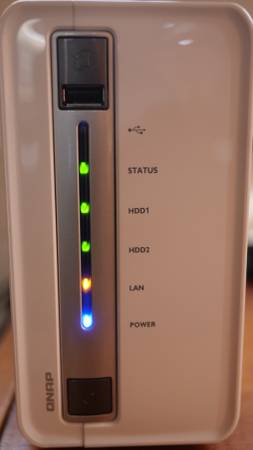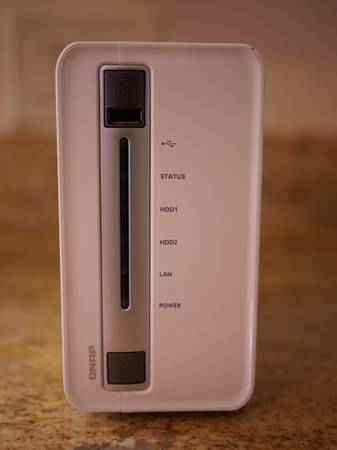 I have a small personal computer server / network attached storage (NAS) for sale. This is a QNAP brand, model TS-212 and it comes with two Western Digital brand 2 TB hard disk drives (HDDs) pooled together for 4 TB of total storage space. This gets connected to your home wireless router using a standard ethernet cable and then all computer devices on your home network can access files stored on this NAS. Complete technical details for the NAS and drives are located below.