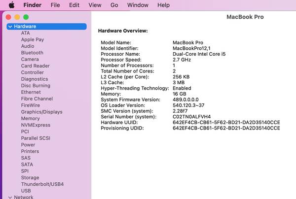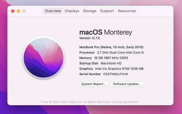Apple 13” MacBook Pro Retina, Early 2015, Model A1502. 2.7 GHz Dual Core Intel Core i5. 16GB RAM. 500 GB Solid State Drive (SSD). Camera and WiFi are all functional. Comes with an Apple 85W charger....
