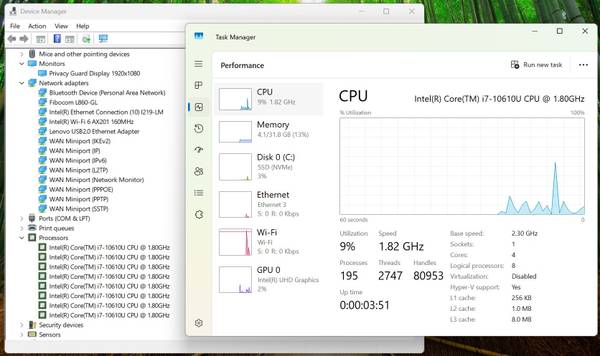Inside is Intel’s Core i7-10610U, a four-core chip with eight threads and vPro support. It runs quietly but has no trouble keeping up with complex workloads or long multitasking sessions. The system carries thirty-two (32G) gigabytes of memory—rare for this model—and a fast 512 GB NVMe solid-state drive. Together they make the machine feel quick even when several large programs or browser sessions are open.