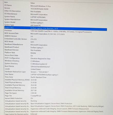 Surface Laptop 5 for Business - Black Model 1979 Intel Core i7-1265U CPU 10 Core 32GB Memory 1TB SSD 15” Touchscreen 2496 x 1664 Intel Iris Xe Graphics Windows 11 64-bit, Excellent conditions - like...