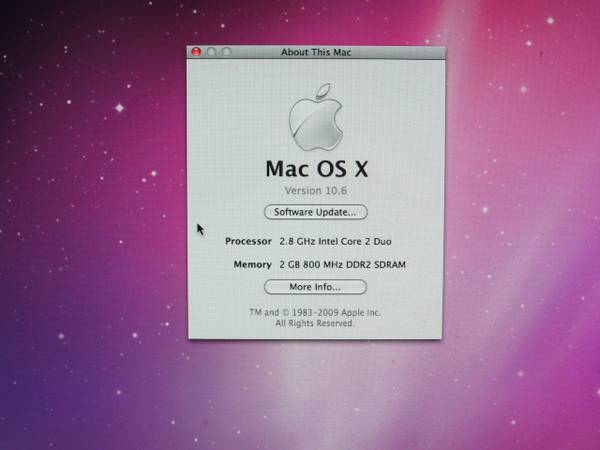 Has a fresh install of Mac OS 10.6.0 Snow Leopard that boots to the setup screen.