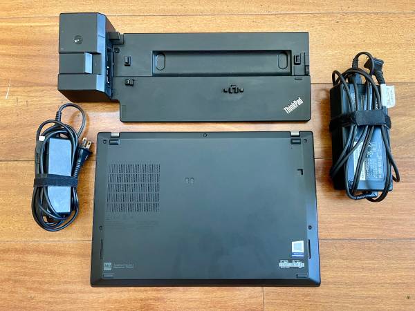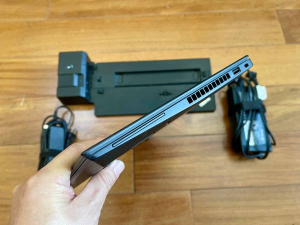 Also part of this set is a Lenovo ThinkPad 40AJ docking unit with its 135-watt power brick, expanding connection options to include HDMI, DisplayPort, Ethernet, and several USB ports. The dock alone typically retails for over a hundred dollars but comes included here at no additional cost.