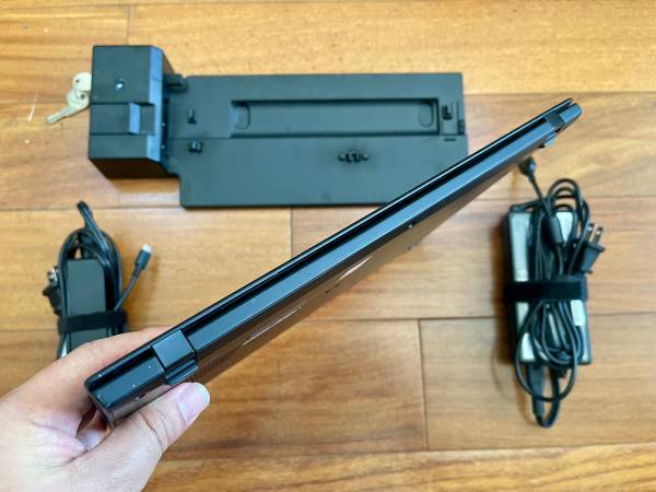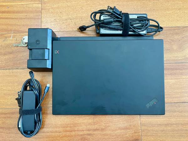 Constructed from carbon fiber and magnesium alloy, the chassis is both strong and lightweight, weighing approximately 2.4 pounds. The battery retains roughly 90% of its original capacity, providing several hours of use, and a genuine Lenovo 65W USB-C charger is included.