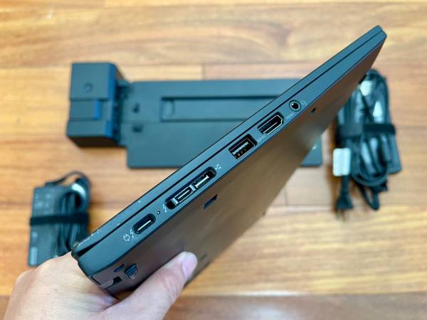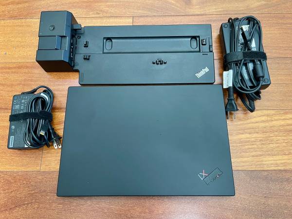The package includes a Lenovo ThinkPad 40AJ docking station with its 135W power adapter. The dock provides multiple USB ports, HDMI, DisplayPort, and wired Ethernet, allowing the laptop to serve as a complete desktop workstation when connected.