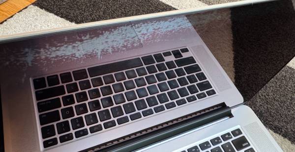 —Along the top edge of the screen in the black bezel area, there is adhesive residue from a camera cover. This is only visible at certain angles and does not affect function at all.