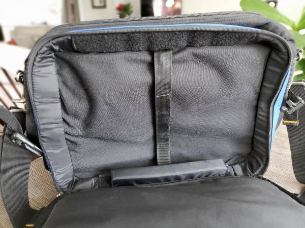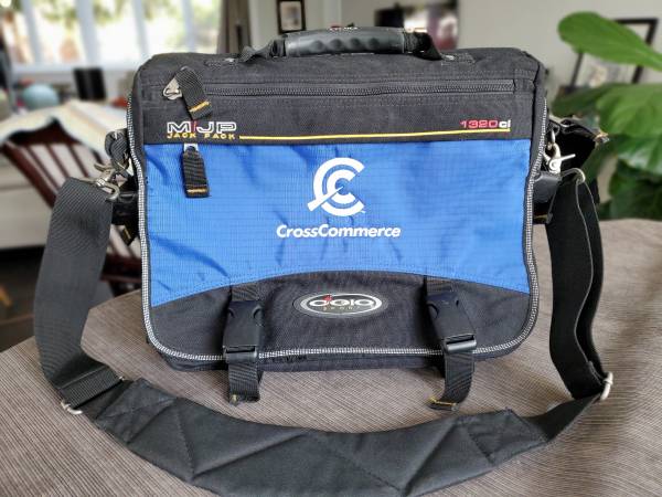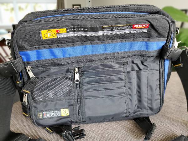 Ogio CrossCommerce Blue/Black Laptop Carrying Case Lightly used Padded adjustable shoulder strap, many zipper compartments, padded laptop compartment and plastic buckle closure on the front flap...