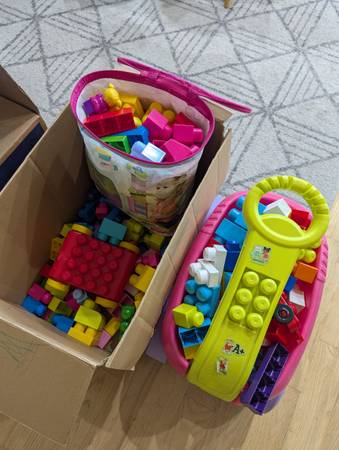 Large collection of colorful Mega Bloks in storage containers. Comes with a cart for fun clean-ups.