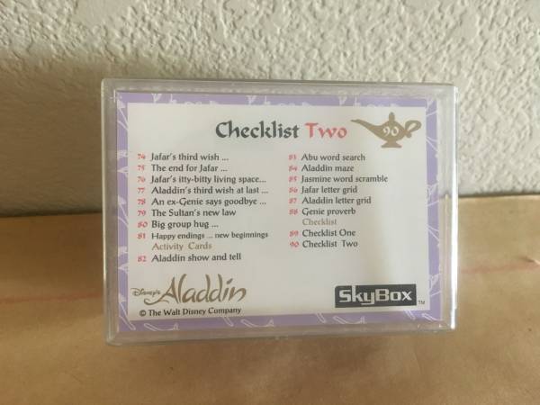 This is a complete Disney's "Aladdin" 1993 Skybox trading card set. Set has been stored in plastic box and has never been used. Set includes 90 cards. Set in excellent condition. S1639S Disneyland...