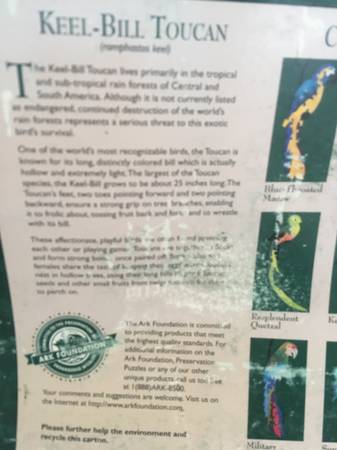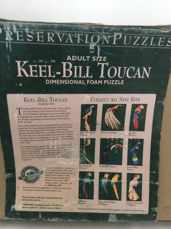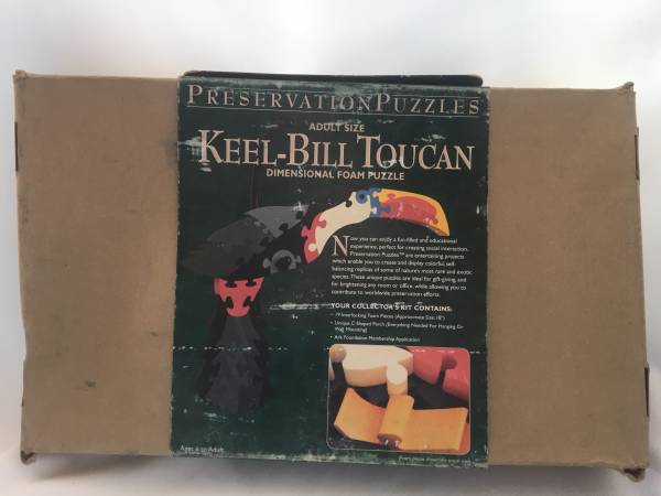 Preservation Puzzles Foam Bird Puzzle ADULT- Keel-Bill Toucan. I personally have kept these in my covered porch in my bushes for over 12 years. They withstand the elements very well. I just wash them with soap and water about once a year and they are good to go. Adds A little color and personality to the area. A half hoop perch is included to hang these on. Please refer to pictures for particulars. These are considered Vintage as they are no long made and hard to find.