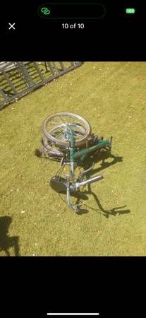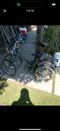 Green North Woods folding bicycles in good condition. Everything works, but they will need new tires and inner tubes. 16" rims. Overall length is 55". Seat height and handle bar height is adjustable. These were stored in my British mother in law's house for years. I never saw her ride them and gave no idea how long she had them. Proceeds from this sale will go to a donation to an animal rescue for senior dogs, per her wishes.