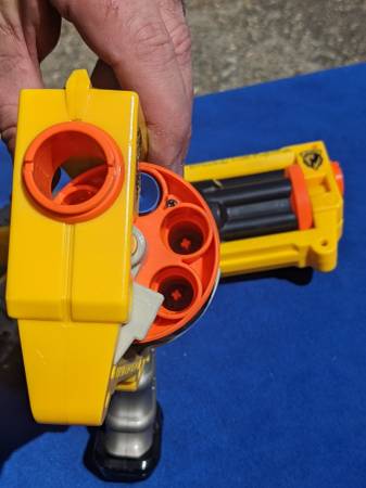 gun foam plastic toy toys kid kids child children boy boys gift present play shoot dart elementary yellow birthday game christmas rotating barrel pistol foam dart strike blasr blaster 6 5 pump action hand inside hasbro
