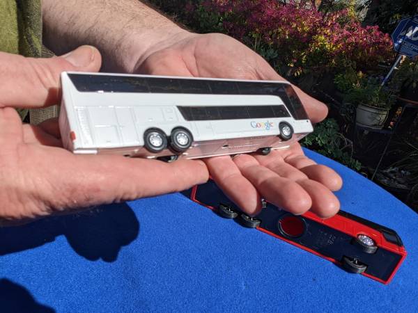 The smaller white bus says Google on the side. It is made of metal. Vant tool. 1:87. $50 cash.