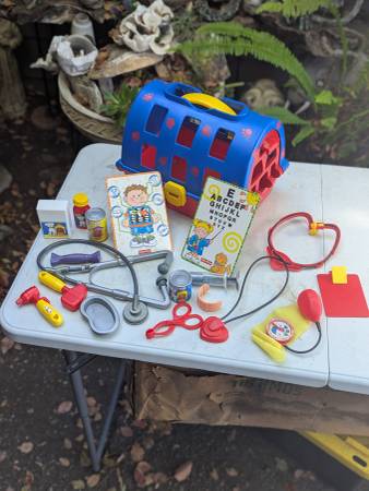 vintage 2000s, kids toys to play Dr for animals...veterinarian gear...Fisher Price set..hard to find this one anymore....$60 cash tosy kit set lot doctor vet pet dog cat case tote barn alm Christmas...
