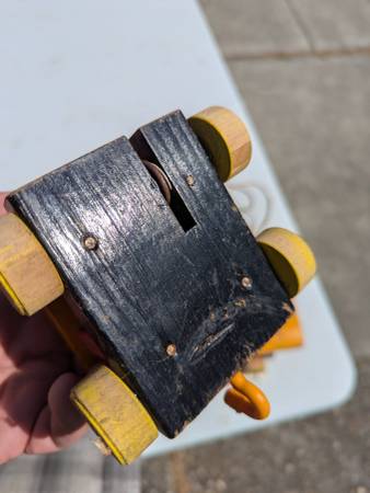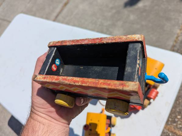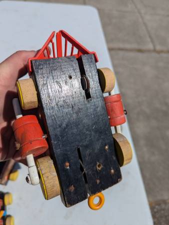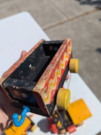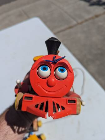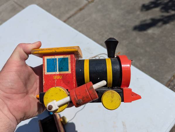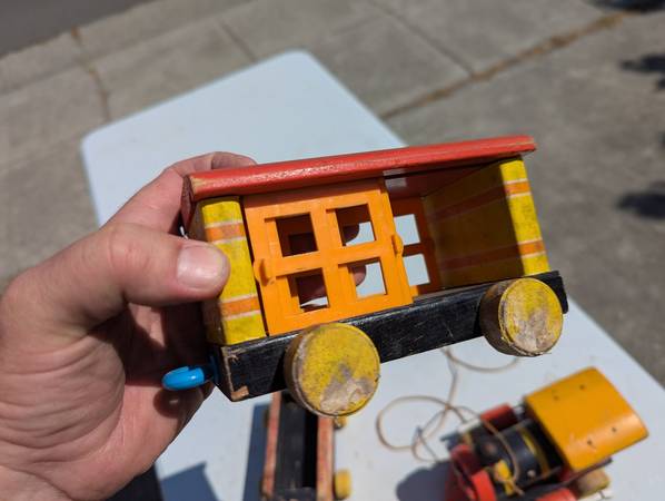 beautiful older 60s era train set, all works fine. $60 cash game games toy toys vnt vintage kid kids fp fisher price engine set wood hp h p huff puff # child childs retro pull push motion action