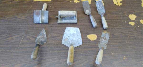 Various Cement Mason Tools: Margin Trowels, Finishing Trowels, Bronze Concrete Grover, Hand and Walking Edgers, Step/Gutter Trowels, Fresno Finishing Trowels. Prices vary from $5.00 up. OBO Photos...