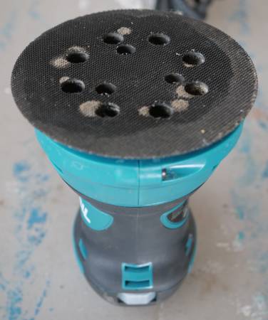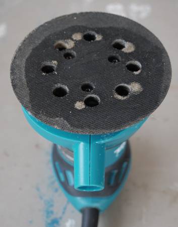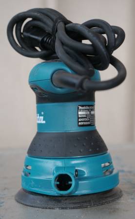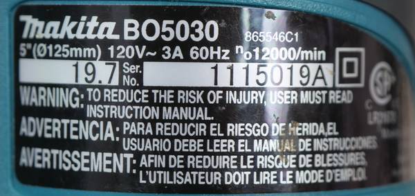 For sale is a powered electric woodworking palm sander. This is a random orbital-type sander. Specifically, it's a Makita brand, model number BO5030. It has a 3-amp random orbit motor that operates at 12,000 RPM. It takes standard 5-inch circular disk sanding pads with Velcro backing. Complete technical details are below.