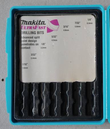 This particular drill bit set includes two different types of bits. The first type includes 7 different split point design wood bits in the following sizes: 1/4", 7/32", 3/16", 5/32", 1/8", 3/32", and 1/16". Pictures 2 to 11 show these bits. The second type is a #8 countersink bit with quick release shaft. Pictures 12 to 17 show this bit. The entire collection is stored within a plastic molded case that measures about 5" wide, 5" deep, and 1" tall.
