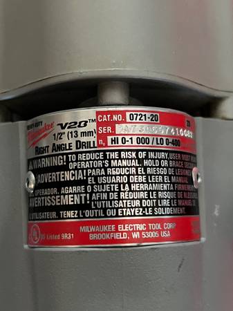 Milwaukee Right Angle Drill 1/2" 28volt. Excellent condition with case and charger. May need to replace battery. Comes with all the accessories shown.