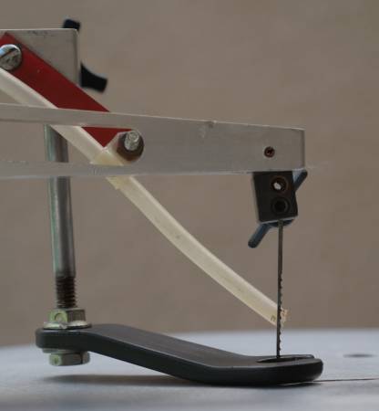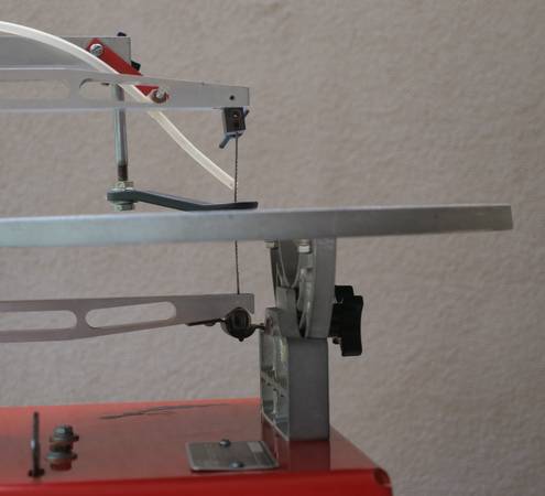 The saw accept standard pin-less 5" scroll saw blades. This is a bottom-feed scroll saw that involves clamping the blade to the bottom chuck. This has a maximum wood capacity of 20 inches, which refers to the throat clearance from the blade to the back of the arm.
