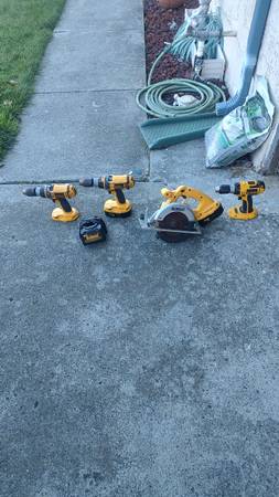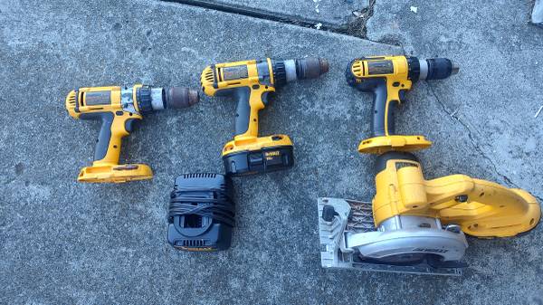 I have 2) Dewalt 1/2 Hammer drills DC988, 1) Dewalt 1/2 regular drill DC725, 1) Dewalt 6 1/2 circular saw DC390, 2) working batteries and 1) working charger... $125 firm, pick up in Santa Clara....