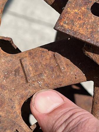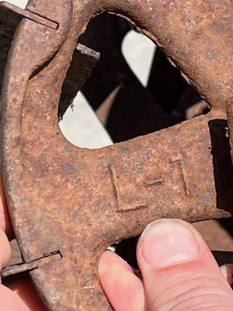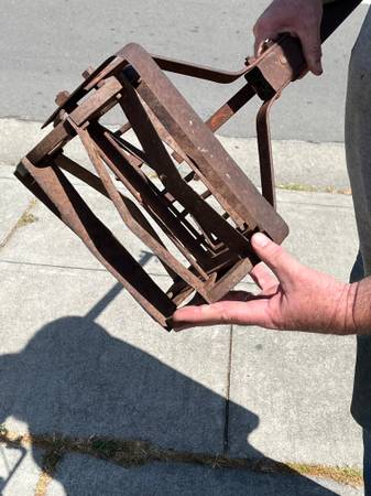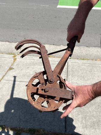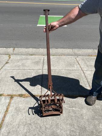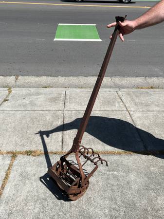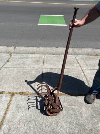 antique vnt retro farm ranch ground dirt till garden gardening gardener pot pots flower plant vegetable p10alme tool old school metal rusty wheel l1 l 1 cultivator planting ranching western cownoy barn tractor part parts hand handle wood aok plow claw clod breakup break up rock weed roho push manual wrought iron rusty metal handtool work