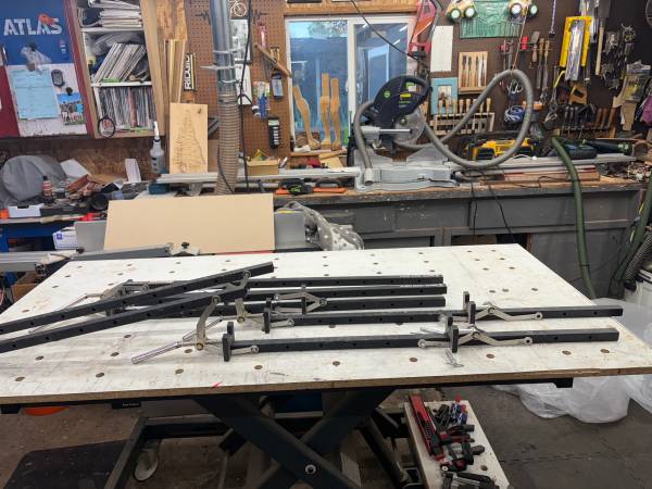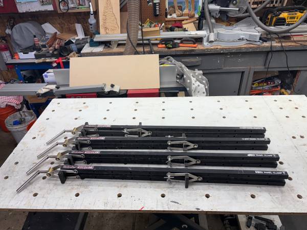 Woodpecker’s Clampzilla four-way panel clamps. work great changing to a different clamping system. (4) Full set 38” and (4) 52” bars. never used still in original wrapping and box . Check Woodpecker’s website saving over $500 worth for this same set up.