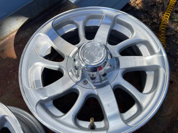 A set of (4) HWT Hispec aluminum wheels 14x5.5. Wheel center caps included. ($150) Used condition with some normal wear and scratches. Rim Diameter 14 inch Width 5 1/2 inch Bolt pattern 5 on 4.5...