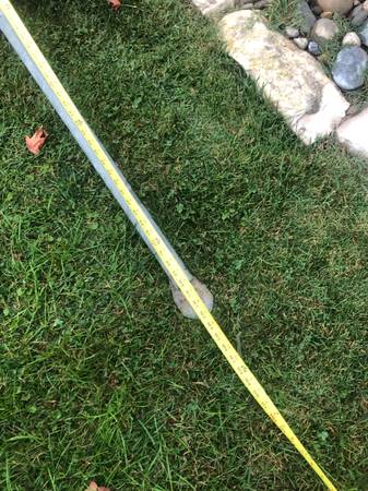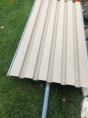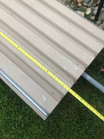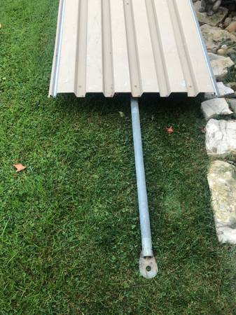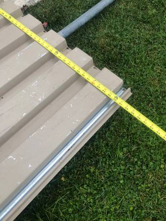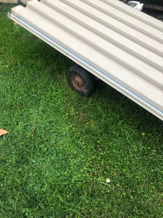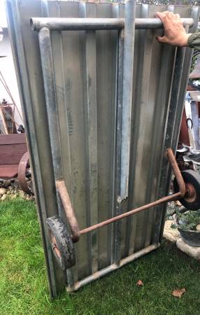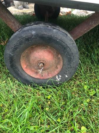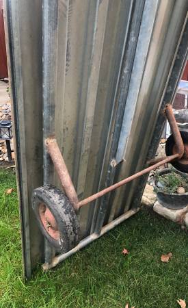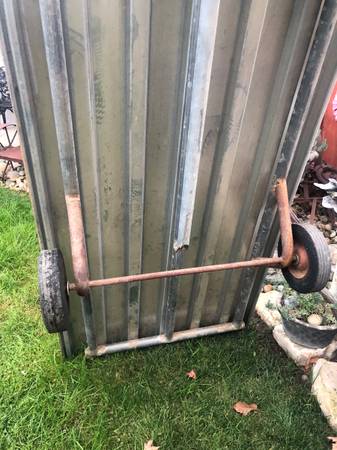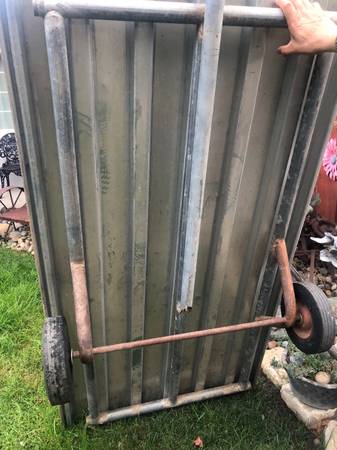 Used. 68 inches long by 37 inches wide. Heavy duty, attached metal floor. Text