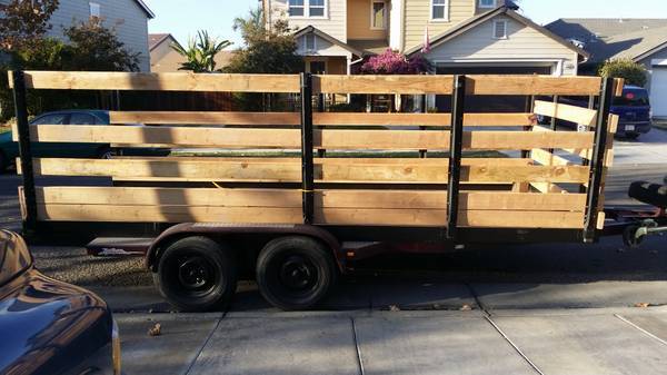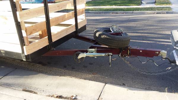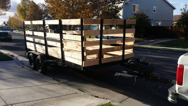 Trailer with side rails. Side rails are removable. Comes with two heavy duty ramps. Can use to transport a vehicle.