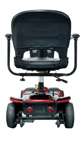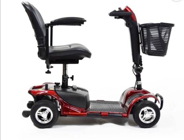 Equate Mobility Power Scooter for Travel, Adults, Elderly, Red. The 4-wheel configuration provides additional stability, quick and easy to disassembly into easy-to-transport pieces. The height-adjustable swivel seat with fold-down backrest. The comfortable armrests are padded and adiustable. It comes with large carry basket and solid, non-marking, flat-free tires for worry-free travel, anti-tip wheels for greater safety, headlight for enhanced safety. The Equate scooter also offers great features like a quick connect battery pack and a delta-style tiller to make operating the scooter easier for those with limited strength or dexterity.
