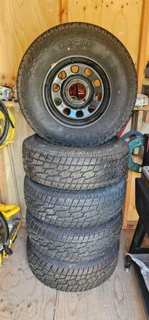 Selling a set of 5 Delinte DX-10 Bandit A/T (All-Terrain) tires mounted on Rough Country steel wheels.
