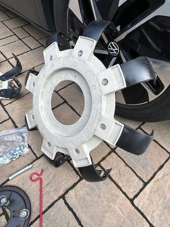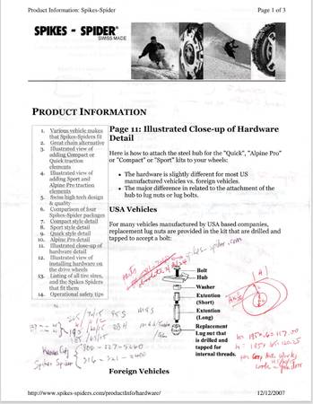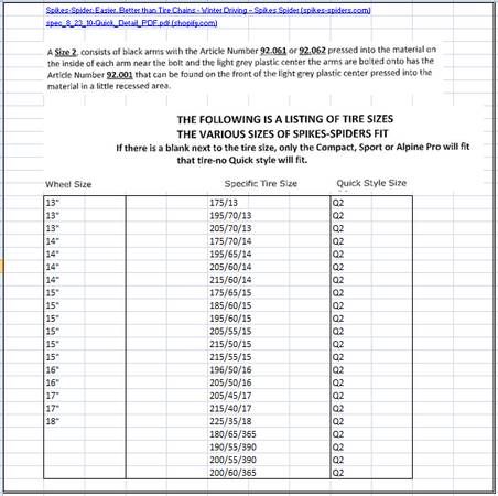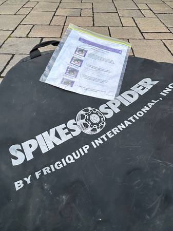 One pair of Spikes Spider tire traction devices for snowy and icy roads. They are a convenient alternative to tire chains, cables, snow tires, and snow socks. Spikes Spiders are expensive when bought new, but this set is the previous "Quick/Compact" model and are reasonably priced. Installation of the Spikes Spider are explained in this video - "https://www.youtube.com/watch?v=vVQF930hLLk". Note that a bracket is installed on each of the drive wheels. They stay installed for the winter season or as long as you prefer. After the bracket is installed, it is simple and fast to attach the traction devices to the wheels. This kit includes:
