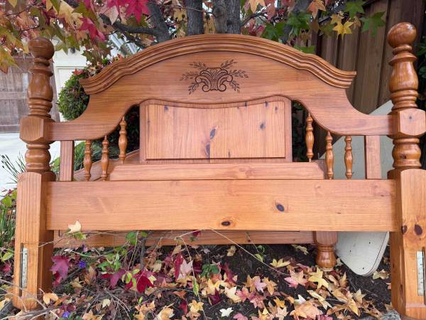 King size bed frame, solid pine wood headboard and footboard Pretty good condition, see pictures You will need a pickup or large van to haul away