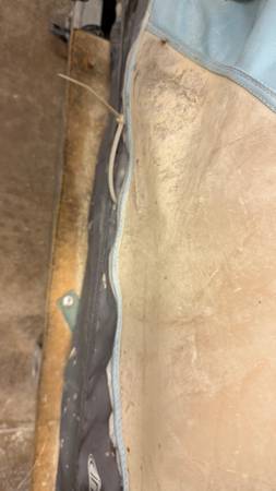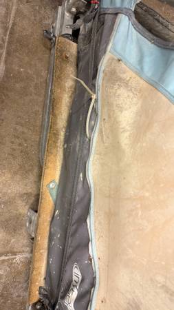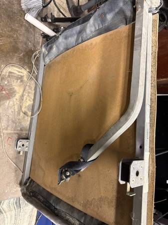 This trailer was modified to have a flat plywood base and the normal carrier cover was removed. The tires were overinflated and the plastic wheels broke. Offering for parts for free.
