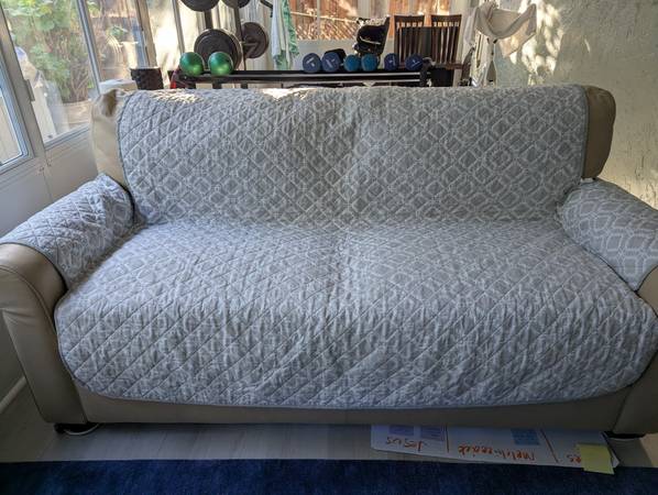 Regular size (shown) and loveseat matching gray with white print. Easy to wash. Great to cover all. Older couch ornif you have pets. They also brighten a room. They don't stay well on leather couches. Free for the asking. I think I got them on Wayfair a few years ago- good condition.