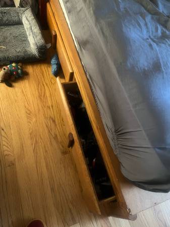 I want it out asap. Pick up only! Full size wooden bed It comes in two halves, each half has two drawers on each side. Ive had this bed for many years, but its slides around on the hardwood floors....
