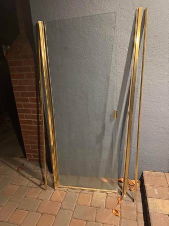 Glass shower door with brass trim Height 70" Width for shower 30" to 31.5" There are some water deposits on the glass and frame but should be easily removable with vinegar/soapy water mixture.