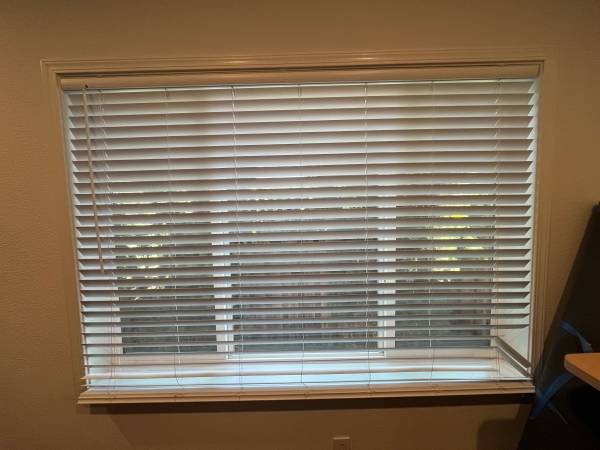 Four free window blinds that fit 77”x53” window opening. One or two slats are damaged but can be removed. Everything still working normally otherwise. Renovated and no longer need. Must take all 4.