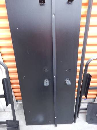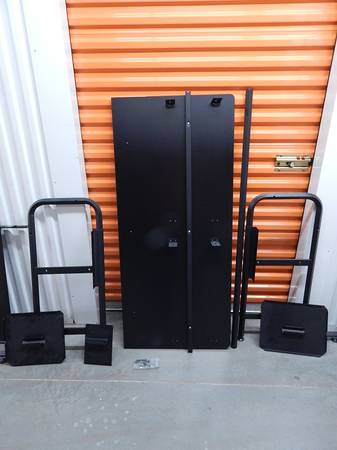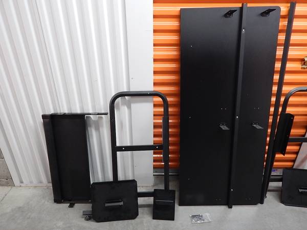 Computer desk. It is presently torn down, and needs to be reassembled. Heavy steel frame. A rail over the rear of the work surface allows three platforms to attach, e.g., for printer, monitor, and phone. With slide-out keyboard tray. It's in great condition. See photos.