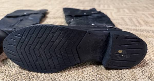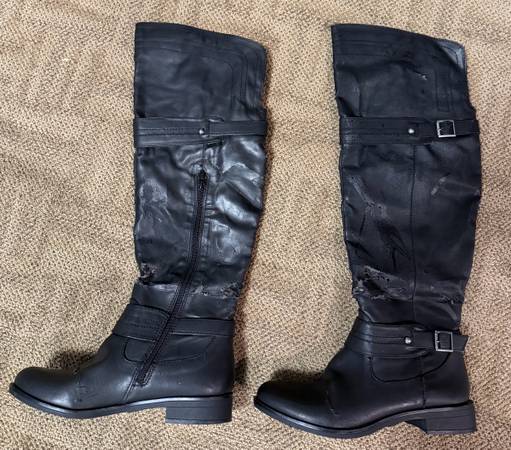 The boots are in very good condition except for peeling of the vinyl around the ankles of both shoes. The other parts of the boots are in good condition (soles, zippers, interior and rest of vinyl).